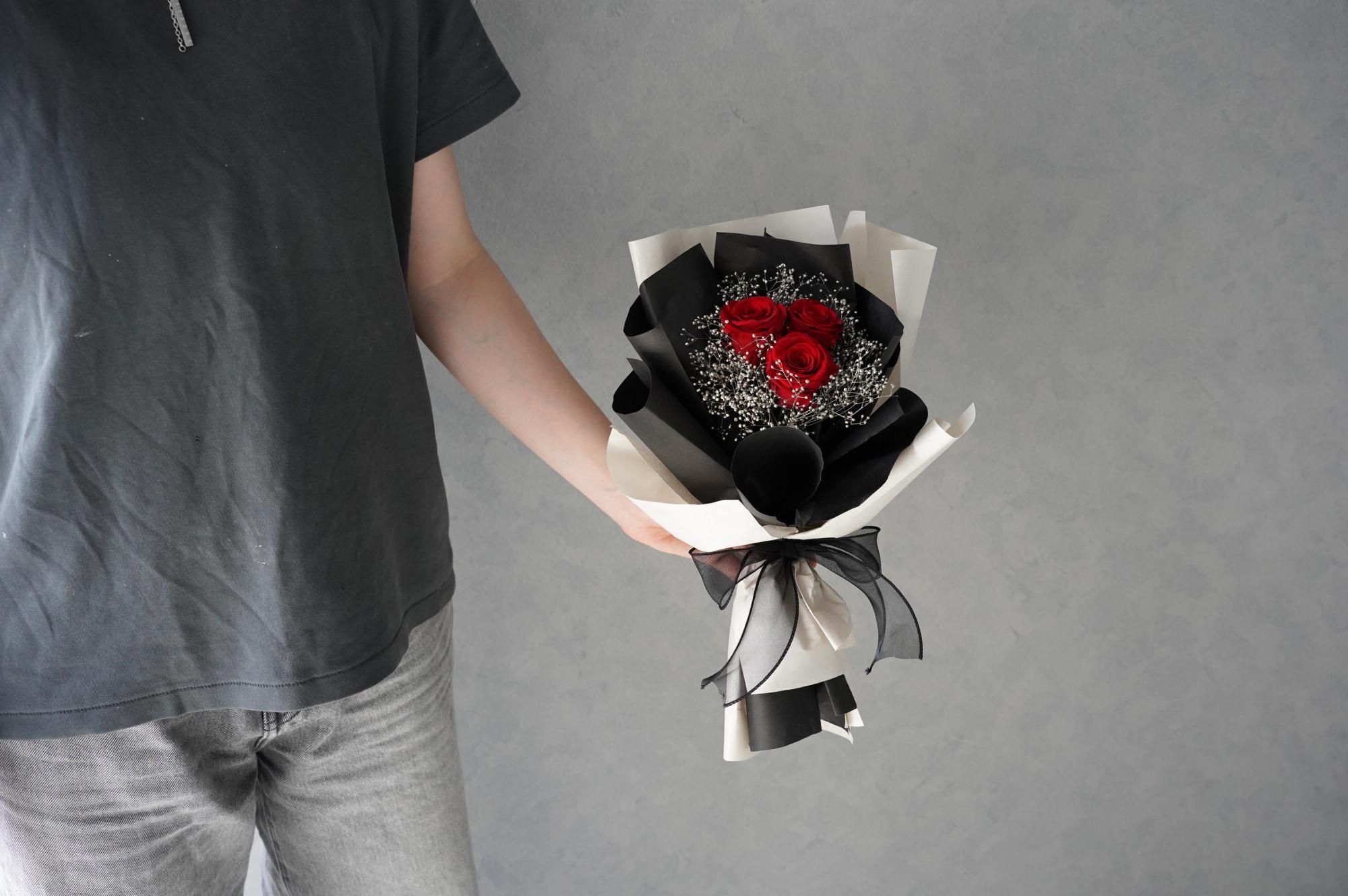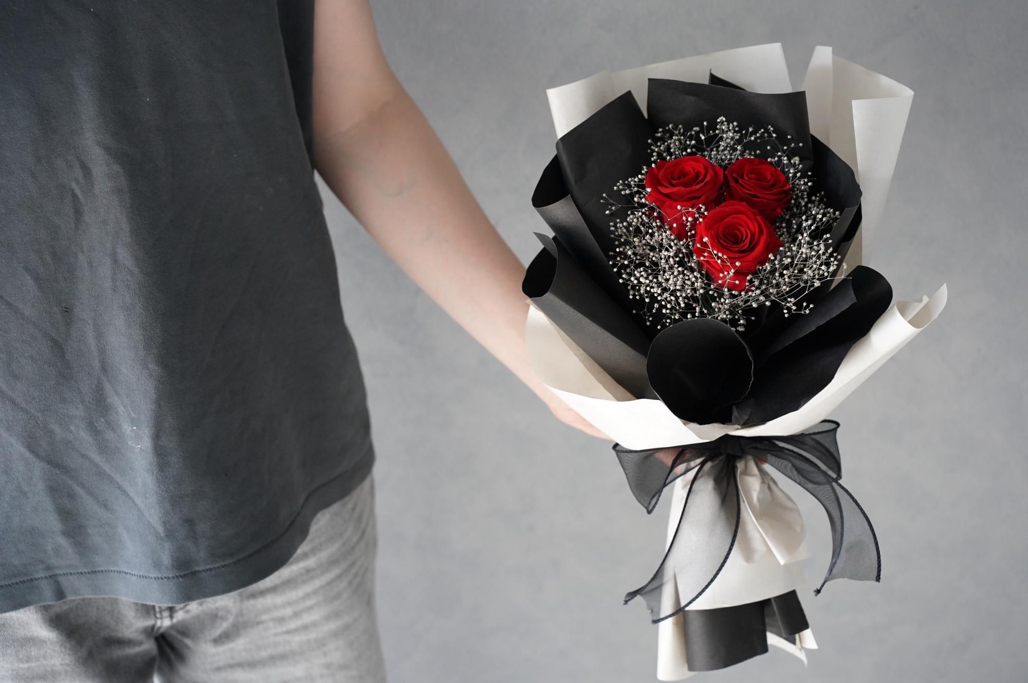 プリザーブドフラワーの赤薔薇とかすみそうの花束となります。