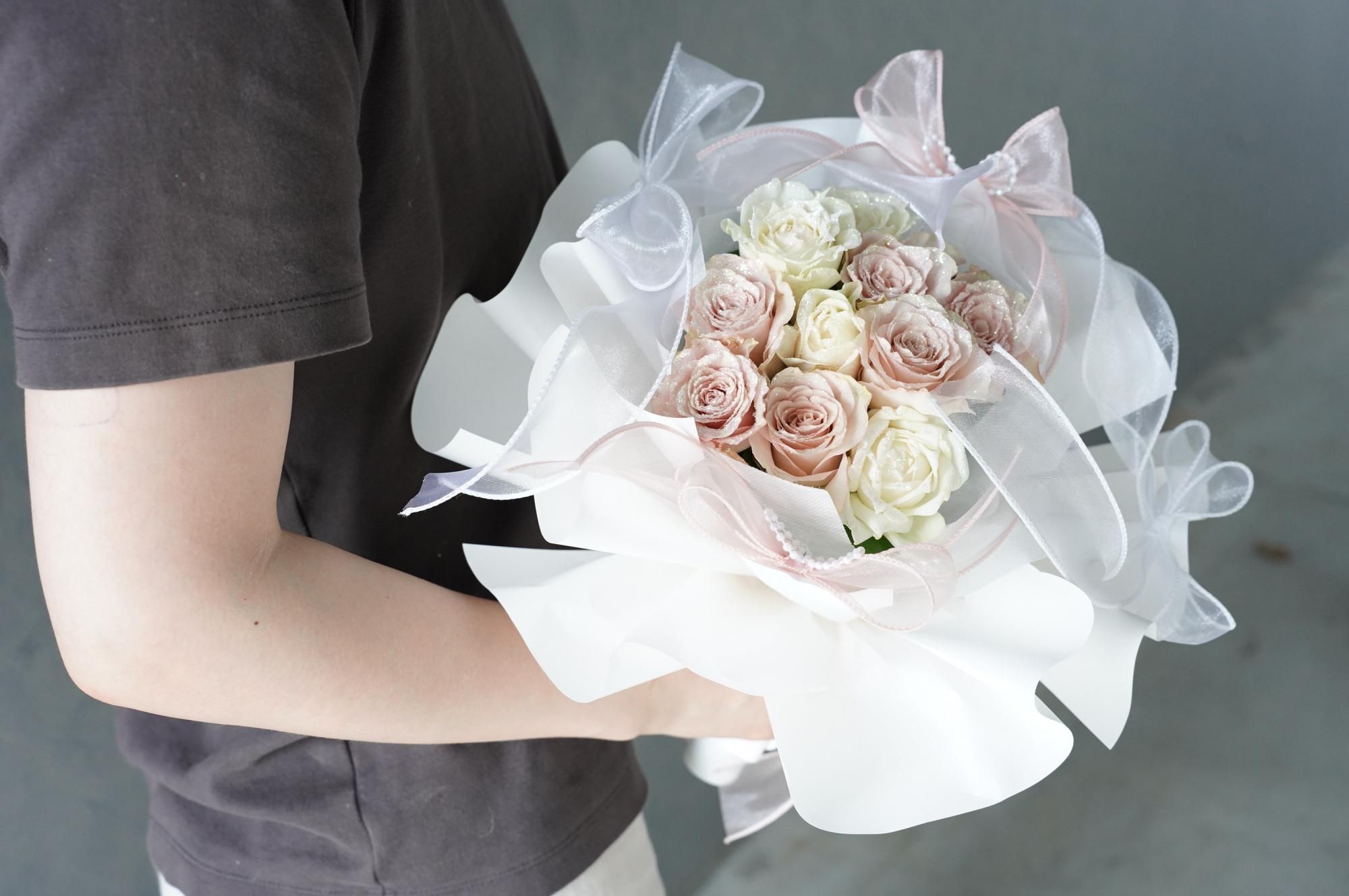淡いピンクとホワイトのグリッターローズを中心に束ね、